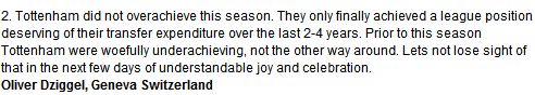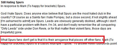 This comes from a Southampton fan – probably one of the ones who took great joy at finishing above Glenn Hoddle’s Spurs (no, didn’t like him either) in 2001 and 2003. Some might have termed their behaviour at the time to be rather smug, perhaps even arrogant (that’s third division Southampton by the way). But the point is that all clubs have the same cross-section of fans – some arrogant, some deluded, some pessimistic, some even-tempered and realistic. For “Spurs” you can substitute the name of pretty much every club in the world except maybe Fulham (unless they win that Europa thing – they will be unbearable after that).
