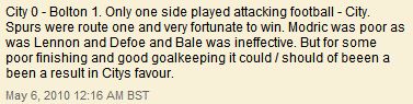I don’t know the affiliation of the author of this piece but it’s a laughable slice of analysis. It’s not untrue to say that Lennon, Defoe and Bale were not at their best but it’s completely untrue to say that “only one side played attacking football”. Tottenham were away to Manchester City a team full of internationals who had smashed five and six goals past opponents in recent games and beaten Aston Villa 3-1 a few days ago.