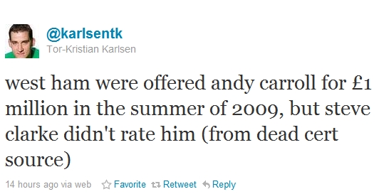 Then along came Liverpool’s new owners, Fenway Sports Group, making demeaning ‘pfft’ sounds as they shoved ‘Arry out of the way and threw £35m at Newcastle (who hilariously rejected the offer at first). Of course common sense took over as Newcastle owner Mike Ashley recalled that he had offered Carroll to Liverpool’s first team coach Steve Clarke for £1m while he was at West Ham. Gift horse. Mouth.