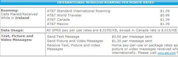 So in total I spent the equivalent of about $30 while away for the week, sending 95 texts within Ireland, 8 texts abroad and spending 12 minutes on calls. The cost of that to me had I unlocked my phone and availed of AT&T ‘best roaming rates’ would have been over $70. Even if I’d bought their ‘World Traveler’ package for $5.99 and taken advantage of 99c rather than $1.39 per minute call rates, I would only have saved $4.80 (12-times-40c). So it would have actually cost me more.